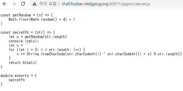 마침 이 웹서버의 설정을 보니 파일경로 설정에 취약점이 보여서, /appsrc/secret.js 라는 경로로 접근하는것을 성공했습니다.