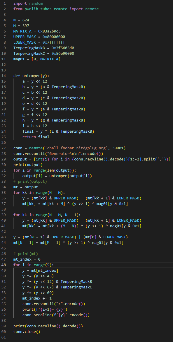 이 문제에서는 특정 랜덤 함수를 분석해서 다음 랜덤값을 예측하는것이 목표인데, 이걸 푼분은 코드에 보이는 언탬퍼링 이라는 작업을 거치면 서버에서 주어진 값을 가지고 그값이 시프트 연산이 되기전의 값을 도출해낼수 있다고 합니다.
