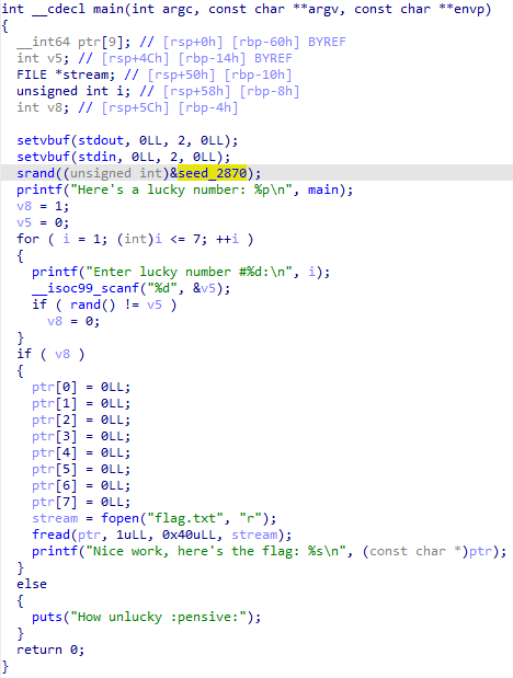 하지만 처음에 main함수의 주소를 제공해주므로, 이 값을 가지고 PIE base 를 구한뒤 offset을 사용해서 시드값의 주소를 알아낸뒤 이 값을 시드로 사용해서 랜덤함수값 7개를 추출한뒤 입력하면 플래그를 얻을수 있습니다.