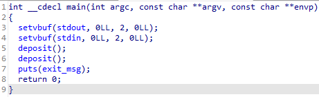 main 함수에서 deposit 함수를 두번 호출한뒤 puts함수를 통해서 exit_msg를 출력하는데