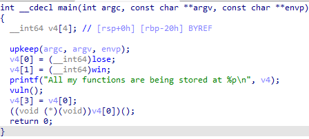 프로그램을 살펴보면 처음에 v4배열의 주소를 알려준뒤 vuln함수를 호출하고 v4[0]에 있는 함수를 호출합니다.