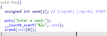 foo함수에서 랜덤시드 값을 입력받는 스택공간과 bar함수에서 추측값을 입력받는 위치가 담긴 스택공간이 서로 같습니다.