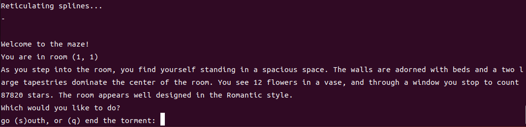 w,e,n,s 를 사용하면 동서남북으로 움직이고 q를 누르면 프로그램이 종료됩니다.