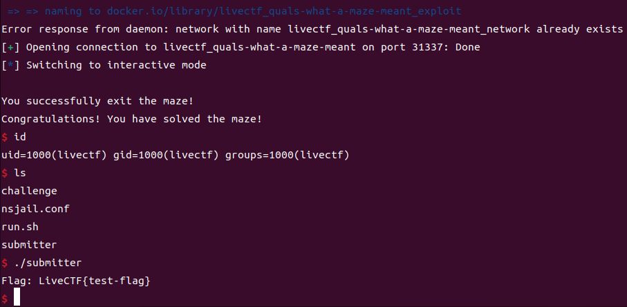 #p.sendlineafter(b'have solved the maze!',b'./submitter')
