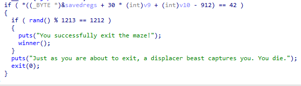 랜덤값을 뽑아낸뒤 그 값을 1213과 나눴을때 나머지가 1212 여야만 미로를 탈출하고 쉘을 얻을수 있고