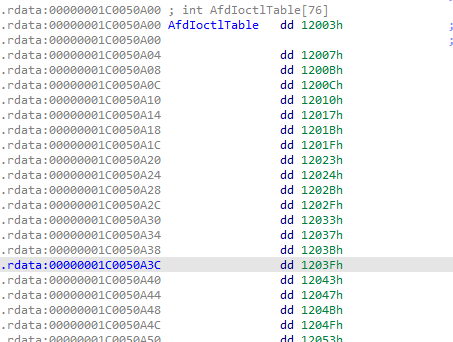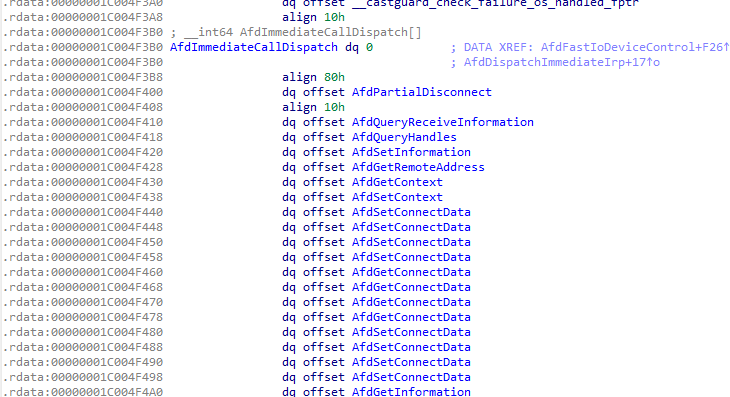 각 기능의 제어코드는 AfdIoctlTable 에서 찾을수 있지만 이 포인터는 AfdIrpCallDispatch 에 존재하지 않습니다.