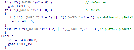 그리고 유효한 사용자모드 포인터인 pData2값과 dwLen(1) 를 사용해서 추가적으로 구조체를 채울수있고 검사를 통과합니다.