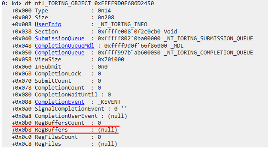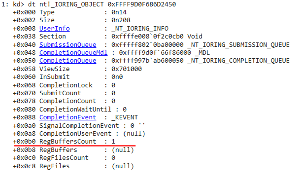 이 커널 개체는 nt!_IORING_OBJECT에 매핑 되어있으며 RegBuffersCount 및 RegBuffers라는 두 개의 필드가 있고