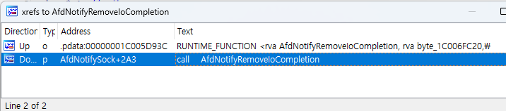 AfdNotifySock에 해당하는 Winsock 함수가 무엇인지 알지 못하므로 커널 코드를 직접 리버싱 해야합니다.