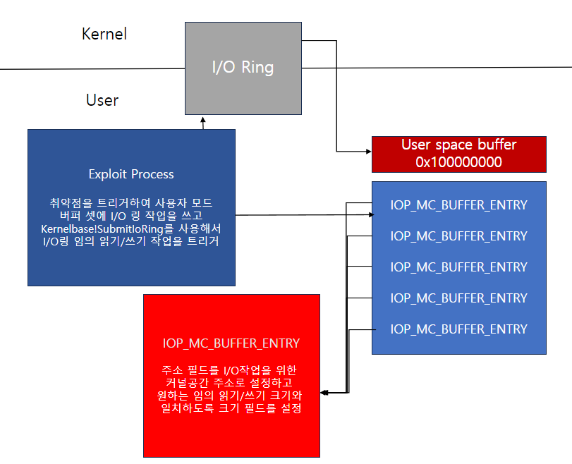 위의 블로그에서 설명하는 취약점을 보면 알수 있다시피, RegBuffersCount 및 RegBuffers 필드를 업데이트 할수 있는 경우 표준 I/O 링 api를 사용해서 커널 메모리를 읽고 쓸수 있습니다.
