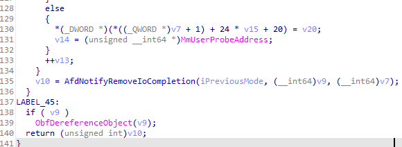 아래와 같이 AfdNotifyRemoveIoCompletion 함수를 호출할수 있습니다.
