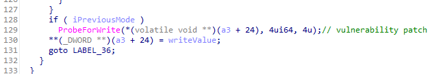 패치가 되고나서는 iPreviousMode 값이 0일때(호출이 커널에서 시작됨)만 값을 쓰고