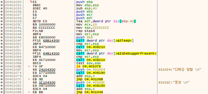 비교한후, 서로 같을 경우, "디버깅 당함"이라는 문자열이 출력되고, 아닐 경우 "정상"이란 문자열 출력됩니다.