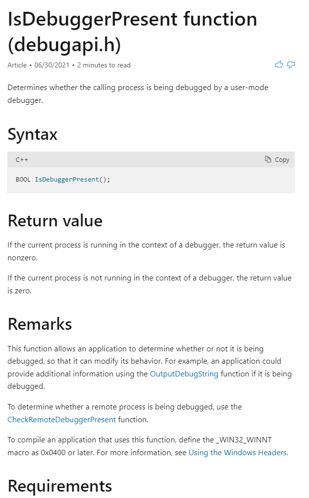 공식문서에서 확인한 내용과 프로그램의 흐름을 분석해봤을때 IsDebuggerPresent 라는 함수가