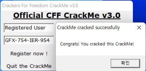 입력받은 Serial값과 비교하는 문자열은 다음과 같으므로, 알아낸 Name과 Serial값을 입력하면 성공메세지가 뜰것으라는것을 알수 있습니다.