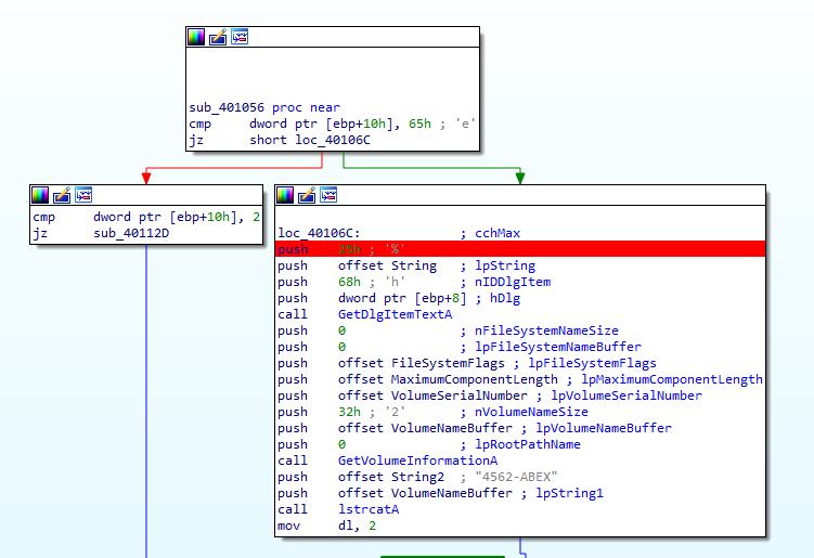 그 다음으로는 아까전에 얻었던 VolumeNameBuffer 문자열과 "4562-ABEX"라는 문자열이 저장된 String2 을 lstrcatA 라는 함수에 인자로 넘깁니다.
