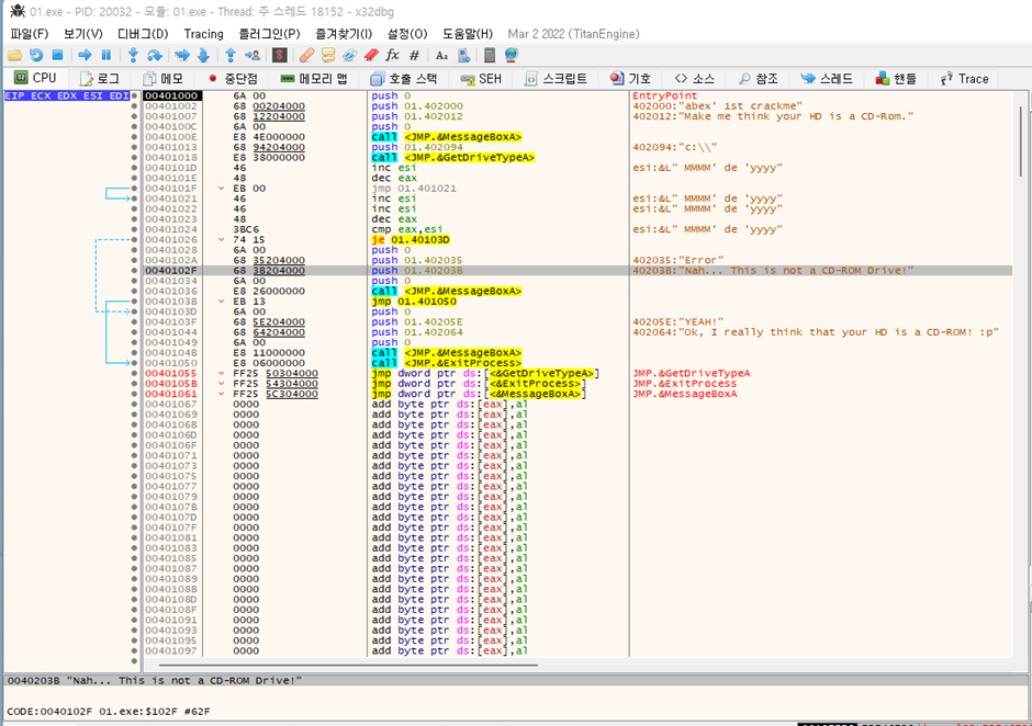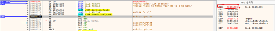 위에서 봤듯이 GetDriveTypeA 함수는 CD-ROM인 경우 5를 반환하기 때문에