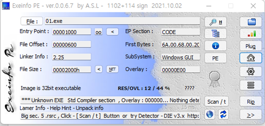 다음과 같이, 아무런 패킹이 안되어있고 32비트 프로그램인것을 확인해볼수 있습니다.
