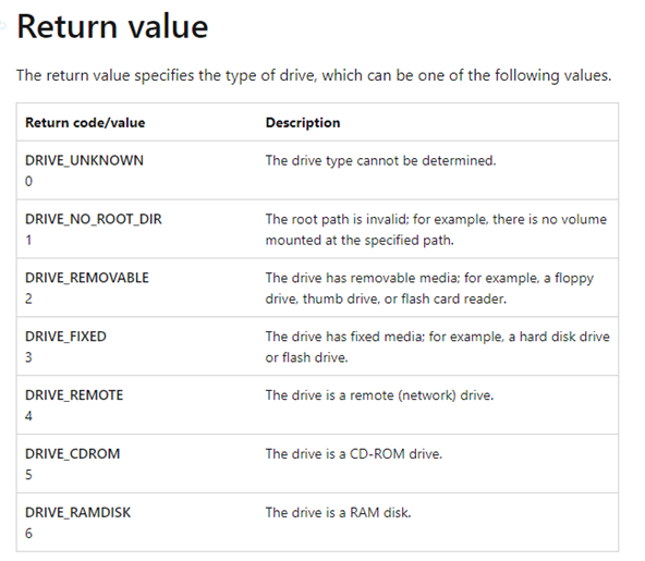 GetDriveTypeA함수는 디스크 드라이브의 유형을 판별해서 그에맞는 반환값을 반환하는 함수인데