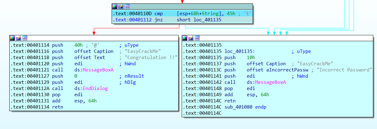 이 부분을 보면 esp+0x68+String 과 'E' 를 비교해서 서로 같다면 성공 메세지박스를 출력하고