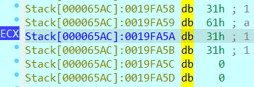 다음과 같이 입력한 값이 아스키코드로 스택에 푸쉬되어 있다는것을 알수 있습니다.