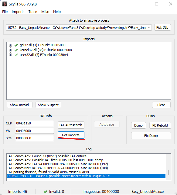 우선 EIP가 OEP를 가리키고 있을때 Scylla 라는 플러그인을 사용할것입니다.