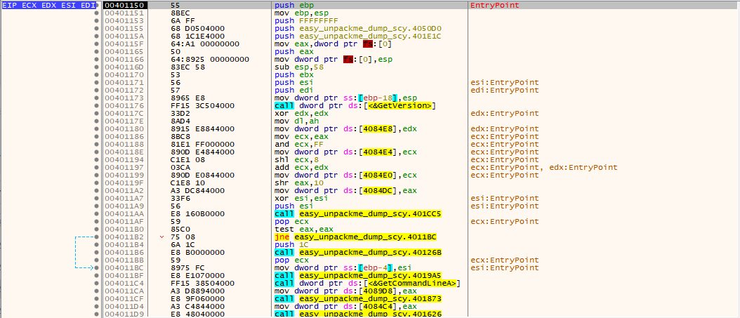 그러므로 이 프로그램의 OEP는 00401150 이란것을 알수있습니다.