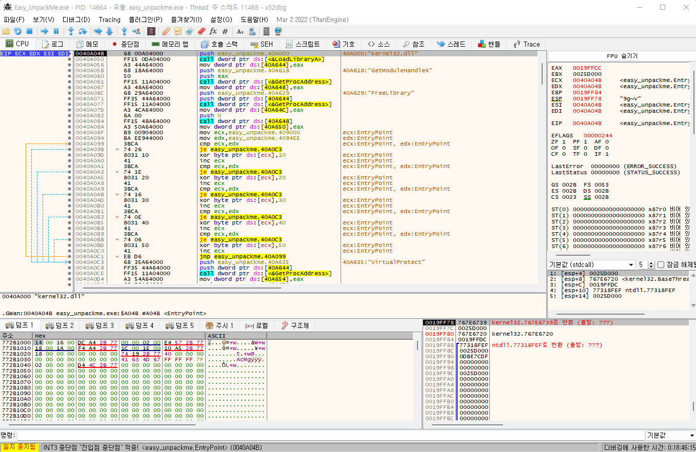 x32dbg를 통해서 연뒤에 F9로 실행시켜주면 예상과 같이 40A04B에서 멈추는것을 볼수 있습니다.