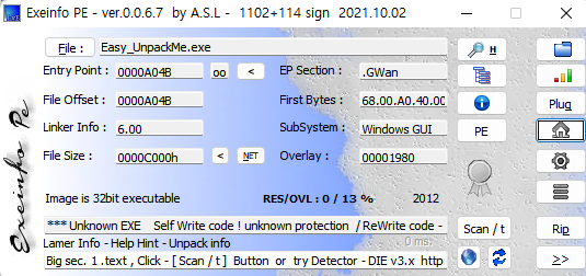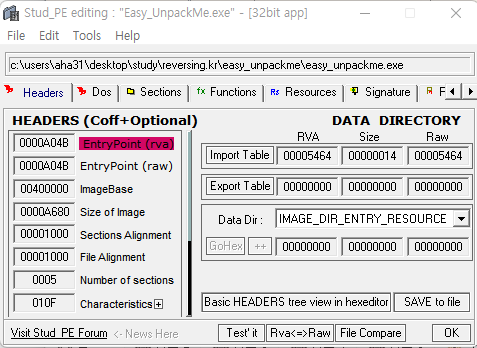 rva값이 A04B이고 imagebase는 400000이므로 40A04B가 EP인것을 알수 있습니다.