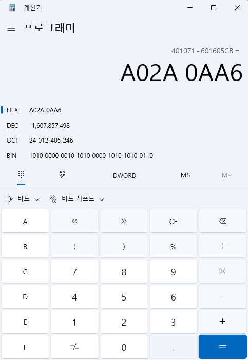 다음과 같은 값이 나옵니다. 32비트 환경인것을 감안해서 단위를 DWORD로 맞춘뒤 계산을 해보면
