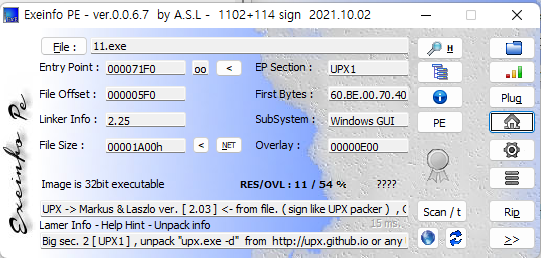 32비트 기반 실행파일에 UPX 패킹이 되어있습니다