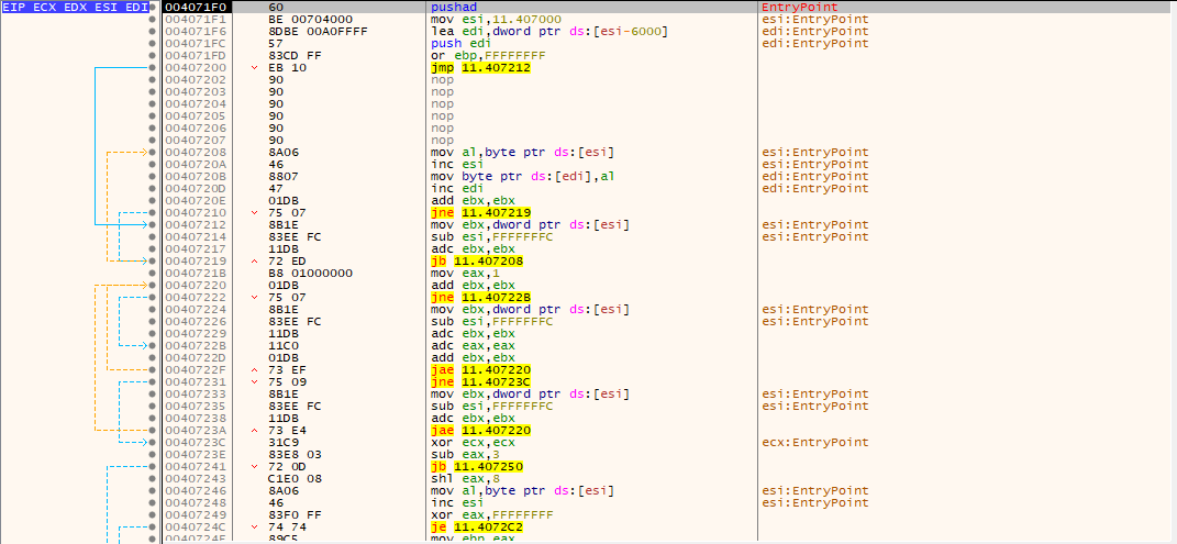 F9를 한번 눌러서 실행시켜보면 pushad로 시작하는 언패킹 루틴이 나옵니다.