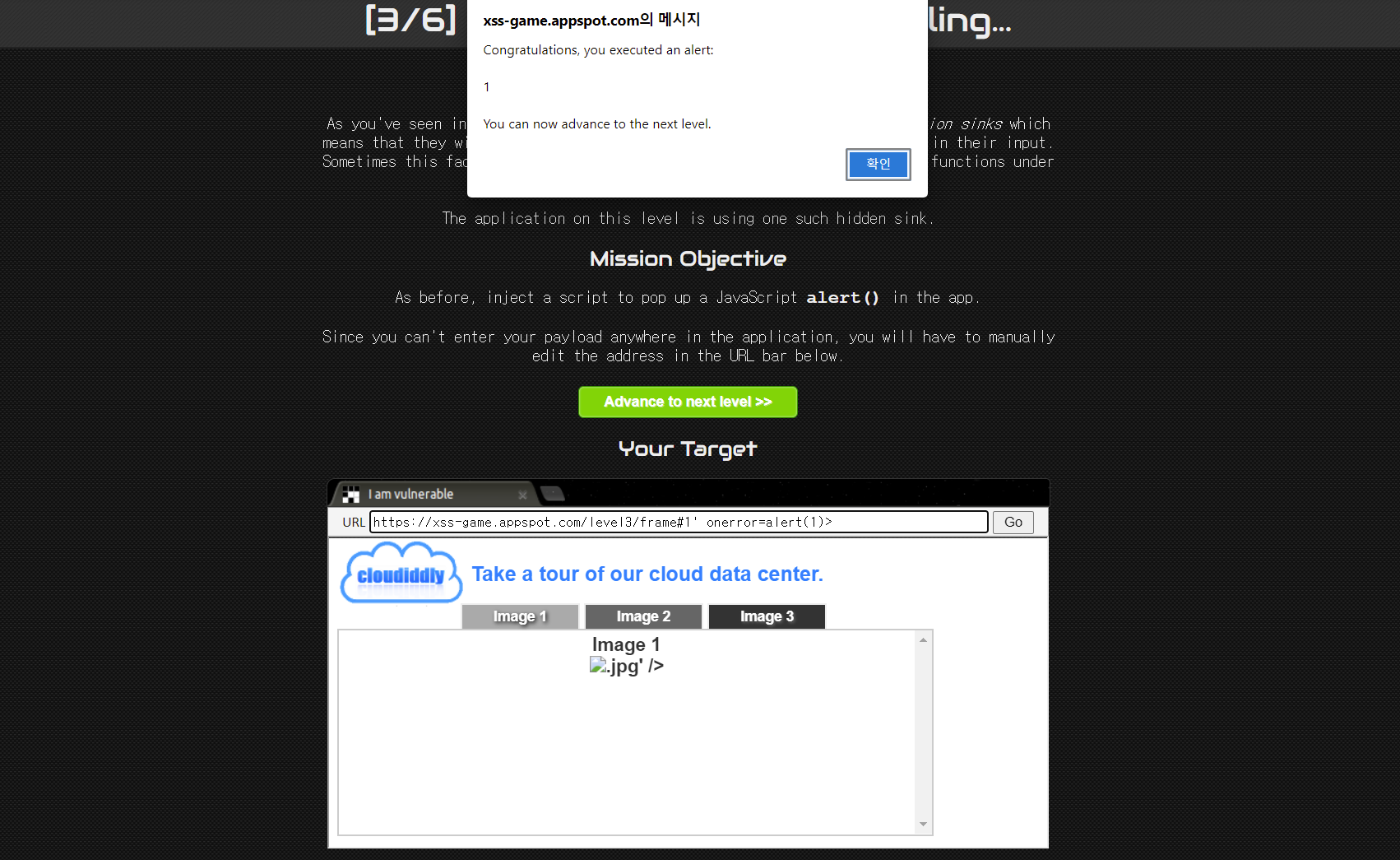 다음과 같이 성공 메세지가 뜨면서 다음 Level로 넘어갈수 있습니다.