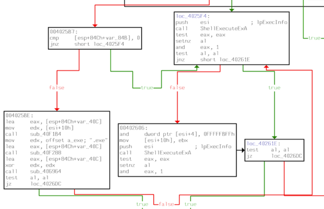 그 다음으로 보이는 이 부분은 .exe 확장자의 문자열이 보이고 ShellExecuteExA라는 함수가 호출되는것도 보입니다.