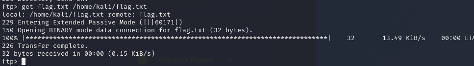 다음과 같이 get 명령어를 이용해서 플래그파일의 내용을 로컬파일로 가져오면