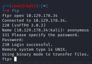 지금까지 얻었던 정보로 이 ftp서버에 접속을 성공해보면 다음과 같이 로그인성공 응답코드가 230이라는것을