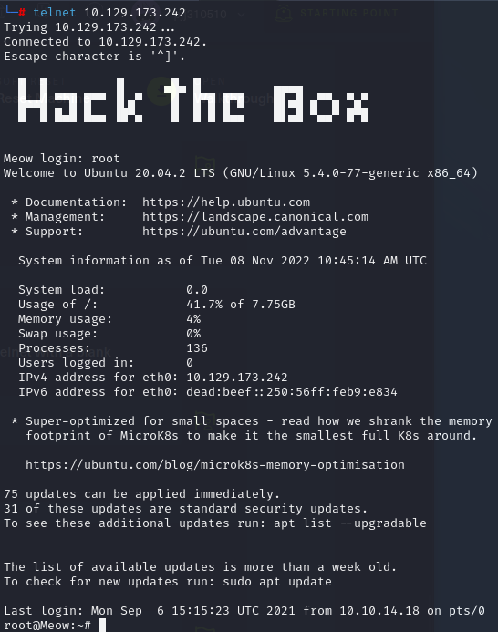 다음과 같이 텔넷으로 접속한뒤 username을 root로 하면 다음과 같이 비밀번호 없이 로그인 됩니다.